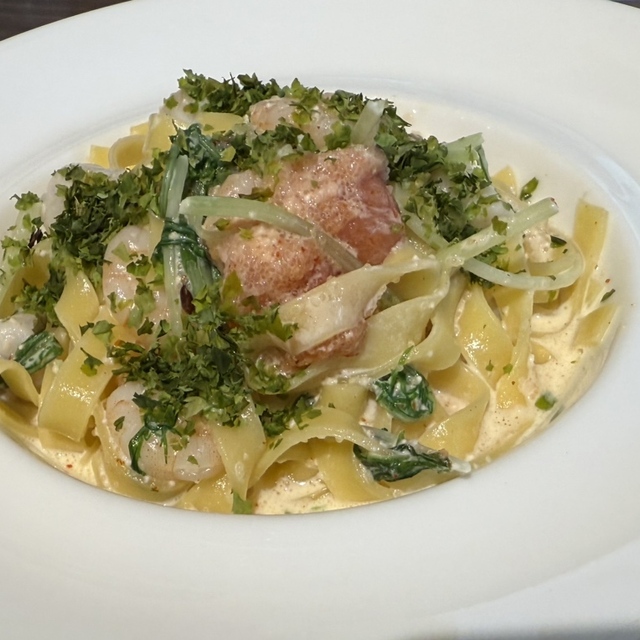 実は麺類でパスタが一番好きなのですが、調理師歴12年で一番美味しいパスタはこれだと断言したいほど濃厚な魚介の風味に濃いチーズの香りが絶妙にバランスを保ってて、平たい麺がまとったソース。。